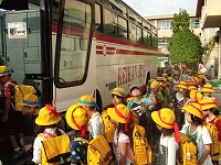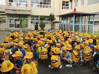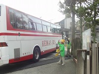 太陽が丘へと出発していきました。幼稚園の登校とも重なり、保護者の方や安全ボランテ