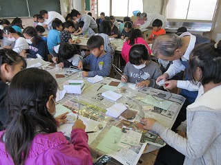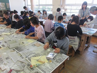 11月7日、8日に、山城郷土資料館の方々に来ていただき、5年生が勾玉作りをしました。日本の古代の装飾品である勾玉についての話を聞き、自分の好きな形に石を切り、削ったり磨いたりしながら、自分だけの勾玉を作りました。