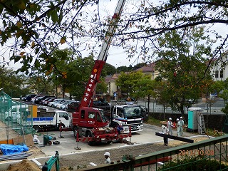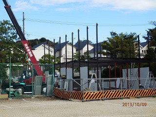 第2仮設校舎の建設が始まっています。先日、基礎が完成し、8日から鉄骨の組み立てが始まりました。10月末に完成の予定です。工事期間中は、ご迷惑をおかけしますが、ご理解・ご協力をお願いします。