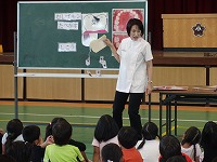 10月5日(金) 体育館で5校時目、1年生児童が、歯科衛生士さんから歯磨き指導