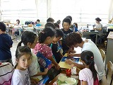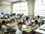 その後、給食も子ども達と一緒に食べていただき、子ども達は選手やコーチの方々とたくさんのおしゃべりを楽しみ、興味津々でした。