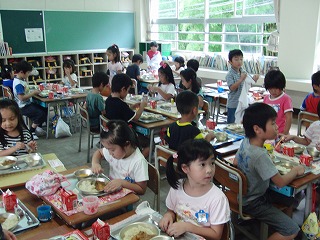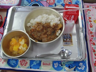 献立は夏野菜カレー、フルーツポンチ、子ども達も甘いカレーの匂いに誘われ、