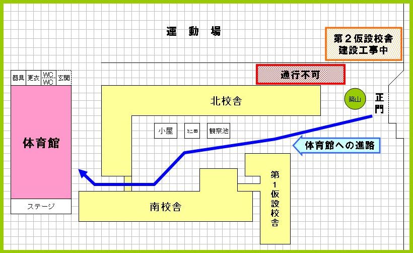 10月14日(月)から仮設校舎に係る水道及び連絡通路の工事も始められるため、正門から北校舎の北側の路地を通って体育館へつながる通路が工事のため通行できなくなります。(10月末まで) 体育館をご利用の場合は、正門から中庭を通って体育館へとお進みください。 大変なご迷惑とご不便をおかけしますが、ご理解とご協力をお願いいたします。
