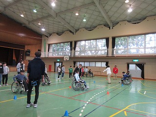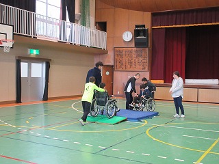 12月12日(木)に5年生が福祉学習として車椅子体験学習を行いました。社会福祉協議会の方から車椅子の仕組みや部分の名称、ブレーキの数、折り畳み方法などを教えていただいた後、実際に自分で乗ってみました。また2人組になって介助したりされたりする体験をしました。体験を通して、少しの段差も進むのが難しいことや介助をするときは声をかけることで乗っている人が安心することなどに気づき、車椅子を利用する人たちやバリアフリーについての理解を深めることができました。