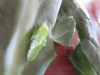 もう「さなぎ」になったのもいます。もうすぐモンシロチョウが生まれてきそうです。
