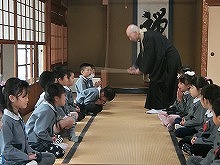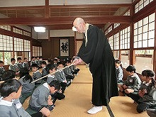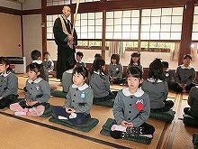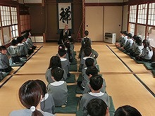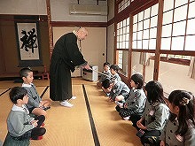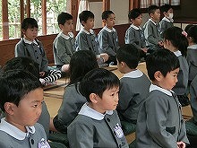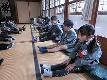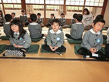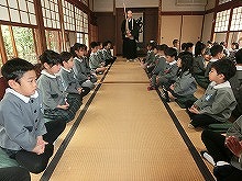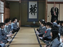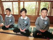 先週はきれいだった紅葉は落葉し、静かな冬の景色に様変わりした一休寺です。坐禅の体験が初めての子どもたちは、真剣な様子で取り組み、静かな時が流れていました。あらかじめ和尚様に、「坐禅中に、心が落ちつきたい人は合掌すると、警策を与えますよ」と、教えていただいたので、積極的に手を合わせる子どもたちがいました。和尚様からは、「長い時間、坐禅ができましたね。一人ではできないことも、みんなですればできますね。みんなで協力したり、助け合ったりすることも大切にしてくださいね」と、お話ししていただきました。帰り道では、子どもは、「どきどきしたけど、背中を打ってもらっても痛くなかったよ」「坐禅して、気持ちがすっとした」と、清々しそうでした。