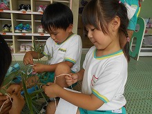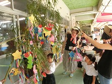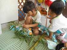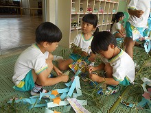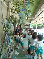 今日は、その笹に幼稚園でつくった飾りをつけました。3歳児はお母さんと一緒に願い事を書いて飾り、4,5歳児は自分たちでこよりを結びました。色とりどりの飾りが風に揺れてきれいです。「自転車に乗れるようになりますように」「泳ぐのが上手になりますように」みんなの願いが、お星さまに届きますように。