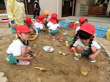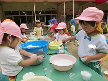 少しずつ園生活にも慣れてきた3歳児りんご組さんといちご組さん。砂場では、「はいどうぞ!」ごちそうを作ったり、クリームのように泡立てた石鹸の泡を触って、「ふわふわ~!」「もっともっとちょうだい!!」と、楽しそうに遊んでいます。
