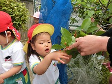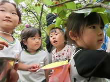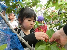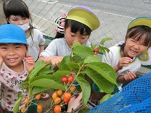 園庭のさくらんぼの実が赤く色づいてきました。お日様をいっぱい浴びて、緑の葉っぱに、つやっと輝く宝石のような色にとっても興味津々の子ども達。今日は、さくらんぼを収穫し、みんなで食べました。「甘い!」「すっぱい!」「家のさくらんぼの味と違う!!」こども達はいろいろ感じ取ったようでした。さくらんぼってこんな風に育つんだね!お日様をいっぱい浴びてみんなの