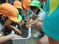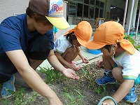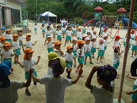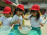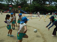 毎朝、体操や、フォークダンスを友達や先生と一緒にしています。気持ちよく体を動かした後は、泡遊びや中当てドッジボールをしたり、4歳児は、ふうせんかずらや朝顔の種まきをしました。クラスや新しい友達にも慣れて、自分のしたい遊びを見つけ、友達や先生と一緒に過ごすこと楽しくなってきている子どもたちです。