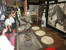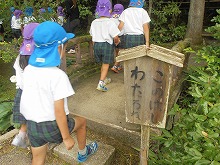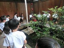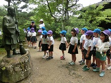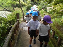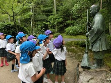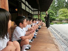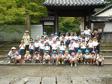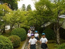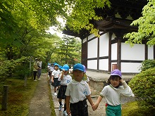 近畿地方も梅雨入りし雨天が心配されましたが、晴れ間をぬって5歳児が一休寺を訪問し、和尚様から一休さんにまつわる話を聞きました。「一休さんは皆さんと同じ歳くらいの時に、お家の人と離れてお寺で掃除をしたり用事をしていましたが、皆さんはできそうですか」と聞かれると「そんなん無理や・・・」「さびしいやんな」と、答えていました。「虎の屏風」や「このはしわたるべからず」の話もきかせていただき、後で「これのことやなぁ」と、興味深そうに見ていました。子どもたちは瑞々しい青もみじの庭を散策し、幼稚園の近くにある一休寺を身近に感じることができました。