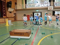 5歳児が、4チームに分かれて玉入れゲームをしました。みんなで協力したり、玉を箱に狙って投げたりと、