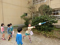 認め合う場面もありました。小学校の先生から「ボール投げ楽しくできたね」と、ご褒美のシールをいただき、大喜びでした。「学校楽しいな」「小学校の先生に褒めてもらった」と、学校を身近に感じることができました。後で、ボールバトンスローで投げる遊びをいっぱい体験させていただき、小学生の気分を味わった子ども達です。
