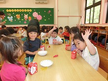 しい先生、新しい友達と「何して遊ぼうかな」と、ドキドキワクワクと遊びを見つけて楽しんでいる子ども達です。3歳児は今日から、牛乳が始まりました。少しずつ幼稚園に慣れ、安心して過ごしてほしいと思います。