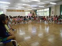 4,5歳児の子供たちは、ホールで新しく薪幼稚園に来てくれたお友達のなかよし会をしました。