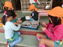 4歳児が家から持ってきたドングリや松ぼっくりで遊んでいます。