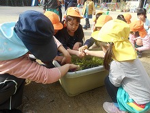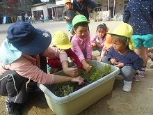 そして、お世話をしていた水菜が大きくなったので、今日収穫しました。種から植え、ハート型の葉からぎざぎざの葉っぱになっていく様子をみて興味をもちながら育てていた子ども達です。お弁当の時間に塩ゆでしたものをおいしくいただきました。