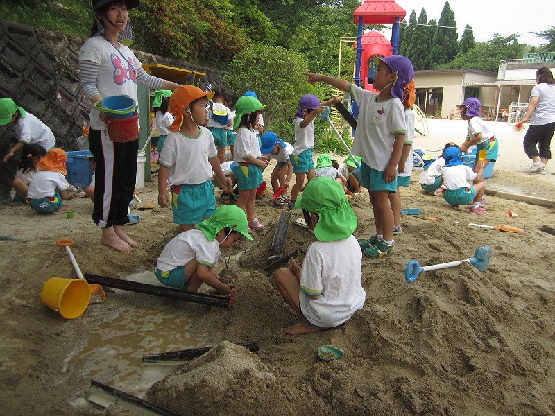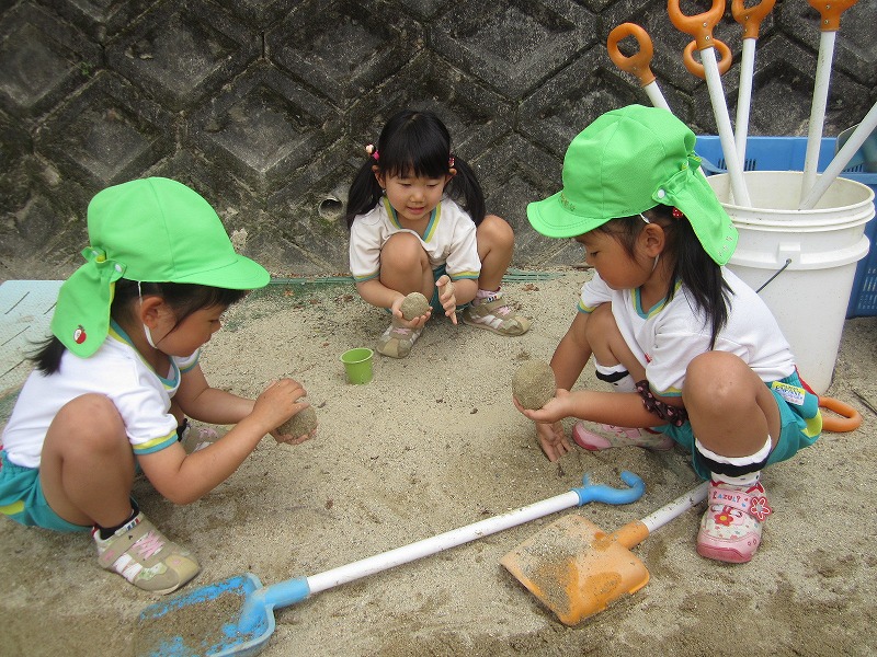 「ここに水流そう」「川つなげよう」「ぴかぴかの団子になってきたよ」と友達とふれあって遊ぶことを楽しんでいます。砂や土、水の感触を楽しみながら繰り返し遊んでいます。