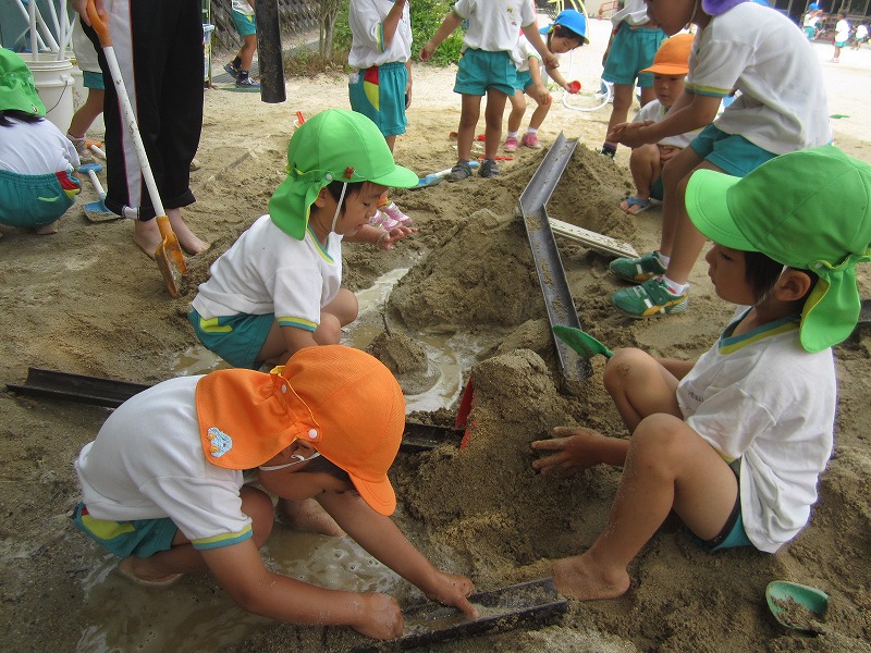 砂場で、どろんこをしたり、といに水を流して川を作ったり、友達と土団子作りをして遊んでいます。