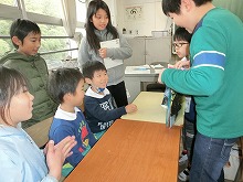 5歳児の子どもたちが薪小学校に行き、5年生に読み聞かせをしてもらいました。先日の給食体験で一緒のグループになった人と一緒だったので「久しぶり!」「僕のこと覚えてる?」など、気さくに話しかけてくれる5年生にニッコリうれしそうな5歳児です。5年生は、幼稚園児が喜びそうな絵本を選んで声の抑揚をつけて読み聞かせをしてくれたり、絵本の中のお話を楽しいクイズにしたりしてくれたりと一生懸命優しくかかわってくれました。絵本の後は、しりとりをしたり、あっちむいてホイをして遊んだりと笑顔いっぱいの楽しい時間を過ごすことができました。「楽しかった」「お話おもしろかったな」と優しい皆さんがいる薪小学校に入学することに、期待を膨らませている5歳児です。