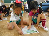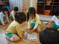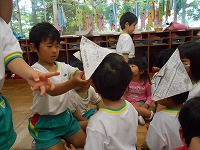5歳児が4歳児にかぶとの折り方を教えにいきました。「こうやってね・・・」と、教えてくれる手元を真剣に見ている子どもです。
