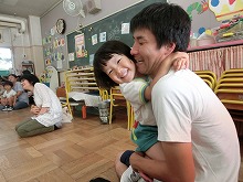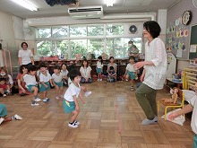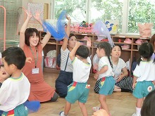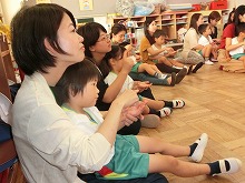 今日は、3歳児親子でわらべた遊びをしました。指を雨に見立てて、「雨粒ポッツンポッツン」とリズミカルに遊んだり、スカーフを広げたり、手からほわっと出して花に見立てたりして遊びました。色とりどりのスカーフが綺麗で、「きれーい!おうちでも遊びたい」と大人気でした。お家の方と一緒に、いっぱい触れ合って幸せそうな笑顔の子ども達。触れ合った温かな感触は、子ども達の心の栄養になっていることでしょう。