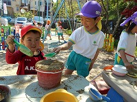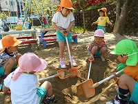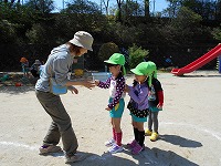 先生や友達と一緒に、鬼ごっこやドンじゃんけんをして元気いっぱいです。砂場では異年齢の友達とふれあいながら遊んでいます。