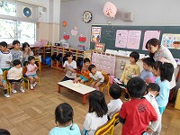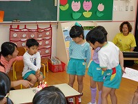 りんご組・いちご組の誕生日会がありました。3歳児は、クラスに5歳児が来てくれます。歌をうたったり、ケーキのろうそくを消したりと、お祝いしました。みんなに注目されて、嬉しいけれど、ちょっと恥ずかしい気持ちに・・・。