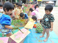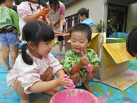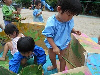 3歳児が園庭で絵の具遊びをしました。「おうちにぬろう」「ペンキやさんみたい」「おもしろいね」と、段ボール箱に思い思いの色を選んでぬったり、手にも塗って感触を楽しんだりしました。園庭で、裸足になって遊び、気持ちよさそうな子ども達でした。これからも絵の具遊びや土、水、どろんこなどいろんな感触遊びを楽しんでいきたいと思います。