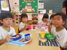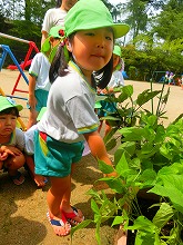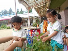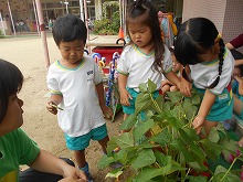 園庭で、いろんな種類の野菜を育てています。パプリカ、ゴーヤ、インゲン豆、プチトマト、ナスなど、太陽の日差しとみんなの水やりのおかげでたくさん実りました。みんなで収穫するのが楽しみで「ここにもある!」「なすび大きくなった」「パプリカやっと赤になった」など、子ども達は野菜を見ながらいろんな発見をしていました。栽培する経験を通して、探求心、命や食べ物を大切にする気持ちなどを養っていきたいと思います。