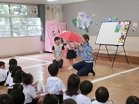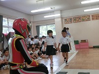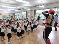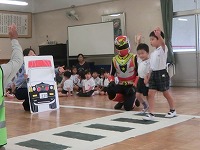 幼稚園で交通教室がありました。梅雨の季節なので、傘をさして道路を渡る時はどうしたらいいかなどを警察署の方に教えていただきました。今年は、安全の正義の味方「ひかるマン」が幼稚園にやってきました。道路の正しい渡り方の見本を見せてもらい、子どもたちは、ひかるマンが見守る中、気を付けて道路を渡る練習をしました。最後は、一緒にひかるマン体操をして楽しく過ごしました。子どもたちには、毎日の登降園でも安全に気をつけてほしいと思います。