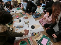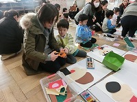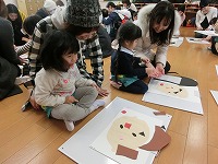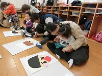 今日は、3歳児の参観日でした。はさみやのりの使い方にも慣れてきた子どもたち。「どんな目にしようかな」「髪の毛はどうする」と、相談しながらそれぞれ工夫した福笑いができあがりました。目隠しを外すと思いがけない顔ができていて、「変な顔になっちゃった」と、親子でいっぱい笑いながら遊びました。