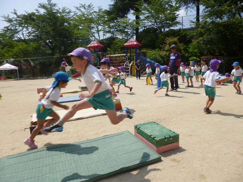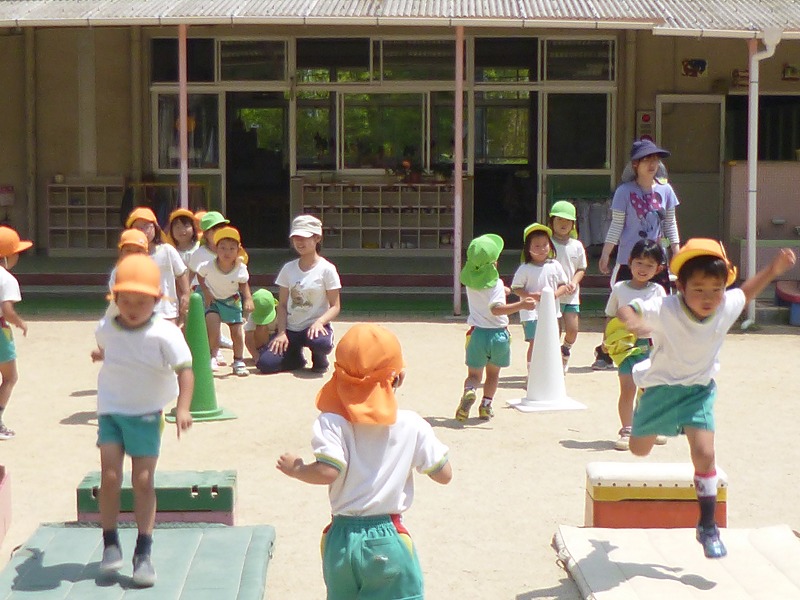 「うしろ向きに跳んでみよう」「遠くに跳べるかな」