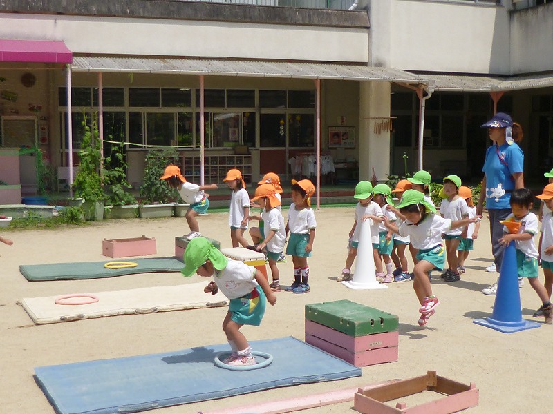 「今日はどんなことをするのかな?」とワクワクどきどきの子ども達。今回は、巧技台やマットを使っていろいろなジャンプや遊びをしました。