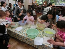 今日は、3歳児の保育参観がありました。「スライムってなあに?」初めて触る子どもも多かったようで、順番に液を混ぜてスライムが出来上がると「わあ!」「ドロドロになった!」「きれい」と、何度も混ぜたり触ったりと感触を楽しみました。