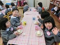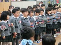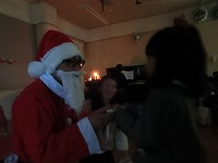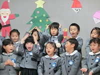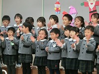 今日は、子どもたちが楽しみにしているクリスマス会がありました。キャンドルサービスの幻想的な雰囲気の中、クリスマスの話を聞いた子どもたちです。学年ごとに、クリスマスソングの合奏やハンドベルの披露があり、手拍子をしたり、一緒に歌ったりしながら楽しんでいると・・・。どこからか、鈴の音が!サンタさんの登場に、「わあ、サンタさん!!」と、子ども達から歓声があがりました。一人ずつプレゼントをもらい、「これ何かな?」「サンタさんに、メリークリスマスっていってもらったよ」と、ワクワクした様子の子どもたちでした。クラスでは、ケーキをおいしそうに食べ、、子ども達にとって、うれしい一日になりました。