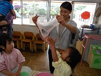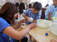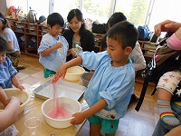 今日は、4歳児の保育参観でした。お家の人と一緒にスライムをつくりいっぱい感触を楽しみました。洗濯のりや不思議な水を混ぜ合わせると・・・。「わあ 固まってきた!!」「気持ちいいな」と、ゼリーのような感触にお家の方も、子ども達も楽しそうです。色もオレンジやピンク、緑と涼しげな色で、たくさん触って遊ぶ事ができました。