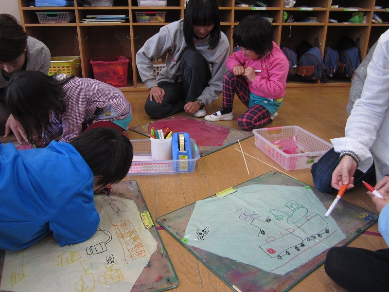 たこづくり・たこあげ楽しかったよ (4歳児保育参観) 1月17日(金) 4歳児の保育参観で六角凧を作りました。お家の人と一緒に、ひごや糸ををつけたり、絵を描いて素敵なたこができあがりました。