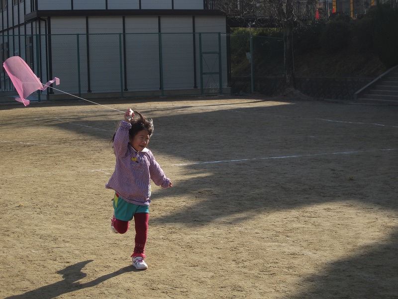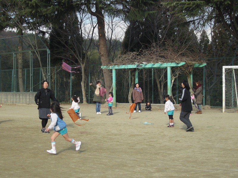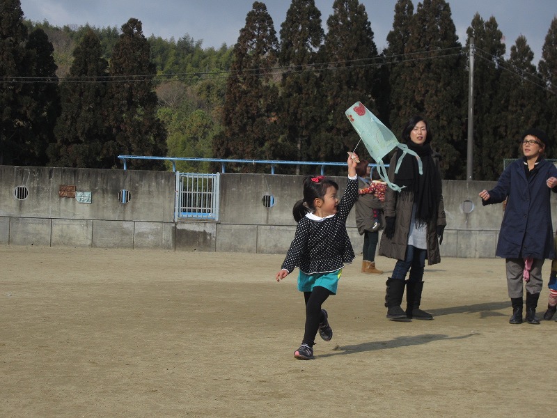 その後、小学校の運動場で、「あがった!あがった!」と、いっぱい走って元気よく凧揚げも楽しみました。