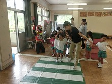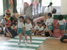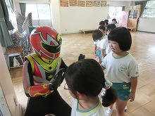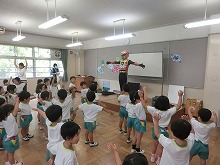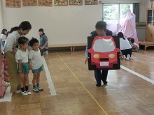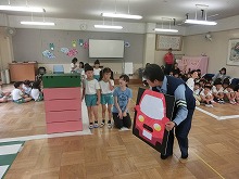 今日は、田辺警察署、交通安全推進委員の方が来園してくださり、幼稚園で交通教室がありました。信号の赤は「止まる」青は「わたってもいい」など信号の色はよくわかっている子ども達。歩行者信号の青が点滅したらどうしたらいいかということも、改めて教えていただきました。ひかるマンから、みぎひだり、前も後ろもよく見て、さらに耳を澄ませて音もよく聞いて道路を渡ることを教えてもらった子どもたちは、模擬道路を渡る体験をしました。ひかるマンから「上手に渡れたね」と、褒めてもらい、最後には体操を一緒に踊ったり、ハイタッチをしてもらって、嬉しそうな子どもたちでした。