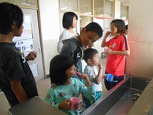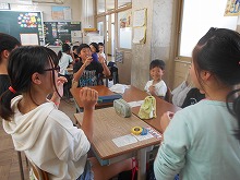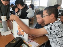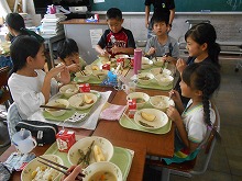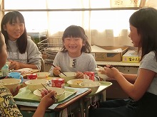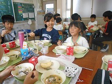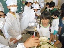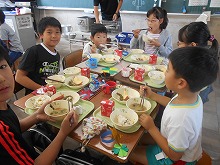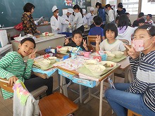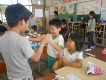 今日は5歳児は給食体験がありました。「楽しみ!」「栗ご飯やって。大好き」と、給食のメニューを知っている子どもたちは、期待も大きく小学校に行きました。5年生のクラスに行くと、「ようこそ薪小学校へ!」と、皆さんで歓迎の挨拶をしてくれて、ペアのお兄さんお姉さんが席まで案内してくれました。配膳の方法を教えてくれたり、食事中は「おかわりは幼稚園の子からしてもいいよ」と、優しく声をかけてくれたりと、和やかな雰囲気にすっかり安心していた5歳児です。給食後は、5年生がゲーム遊びや絵本の読み聞かせのお楽しみも考えてくれました。親切に優しく接してくれた5年生のおかげで、5歳児は楽しく過ごすことができ、小学校に親しみを感じることができました。