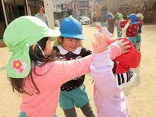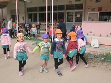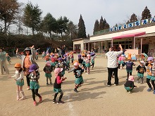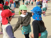2月も最後の日になりました。最近は温かい日も続いて春の訪れを感じられるようになってきました。今日は、子ども達が一年間仲良くしてきた異年齢のグループになってふれあい遊びをし、手をつないだり踊ったりとニコニコ笑顔がいっぱいでした。