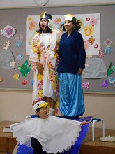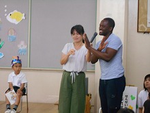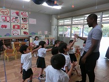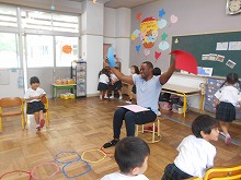 七夕誕生会にも参加してもらい、七夕の5色の短冊の色を「ブルー!」「ホワイト!」など、みんなで言ったり、笹飾りにあった果物や野菜の名前も英語で教えていただいたりしました。先生と触れ合いながら身近な言葉を英語で教えていただき、英語に親しむことができました。