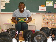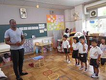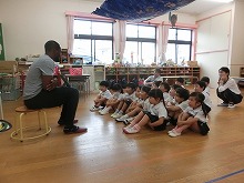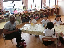 今日は、幼稚園にジャマイカ出身の先生が来てくださり、登園時、「Good Morning!」と、挨拶を交わしました。クラスでは、国旗を教えてもらったり、キラキラ星の歌を英語でうたってもらったりしました。先生が言った色を探すカラーゲームでは、「レッドどこにある?」「イエローやって。あった!」など、クラスをよく見て探し楽しむことができました。