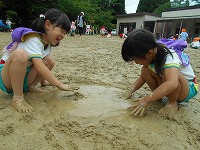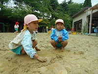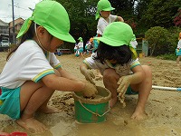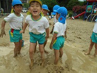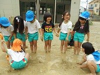雨上がりの園庭は、どろんこでいっぱい!!「ごちそうつくろう」「みてー大きいホットケーキ」「足がぬけないよ!」と、泥の感触を楽しんだり、開放的な気持ちで遊んでいる子どもたちです。友達と遊びながら「一緒にしよう」「どろんこ気持ちいいね」と、会話も弾みました。水や泡やどろんこなどの感触を楽しみ、季節ならではの遊びを十楽しみたいと思います。