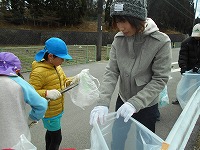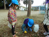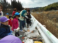 5歳児が、地域の薪神社や手原川横の道路の清掃活動をしました。「ゴミあった」「こんなところにも落ちてるわ」と、隅々までゴミ拾いをし、手原川では、ひまわりの会の皆さんと一緒に、ゴミの分別をしました。「みんなでやったらきれいになったなぁ」と、子ども達は自分達の町をきれいにする心地よさを感じることができました。「ポイ捨てをしないようにしよう」「ゴミは分けてすてよう」と、約束もしました。
