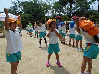 うんていにロープをくくりつけると、子ども達は、よじ登ったり、ぶら下がったりといろんな登り方をみつけて遊んでいます。うんていにも何度も挑戦して、たくさん渡れる子どもも増えてきました。「せんせいみて~」「がんばり豆できたね」と、手のひらを見せてくれます。友達とのフォークダンスも一緒に楽しんでいます。