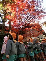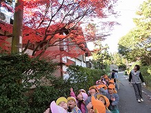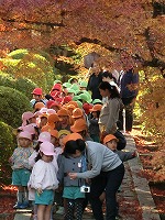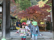 今日から12月。凛とした空気が気持ちよい朝に、3,4歳児の子どもたちが一休寺に散歩に出かけました。行く道中や、一休寺の木々が紅葉していて、子どもたちは「きれいなぁ」「まっかっかや」といいながら見上げていました。ドングリや松ぼっくりを途中でお土産に拾い、秋から冬に移り変わる自然を感じた子どもたちです。