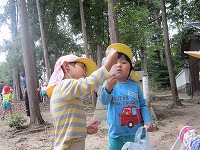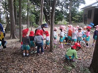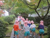 「どんぐりあったよ」「みてー!いっぱいおちてる」と早速秋の自然を見つけた子ども達。友達と一緒に話をしながら、楽しく過ごしました。「一休寺にも、紅葉を見にいってみよう」と足を伸ばして行ってみると、少し色づいた紅葉がありました。「きれいなぁ」といっぱい秋を感じる散歩になりました。