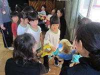 「はらぺこあおむし」や「おむすびころりん」など、子ども達が大好きなお話で、楽しい効果音や人形の動きに「おもしろいな」と大喜びでした。人形と触れ合うこともでき、笑顔いっぱいのひとときを過ごすことができました。